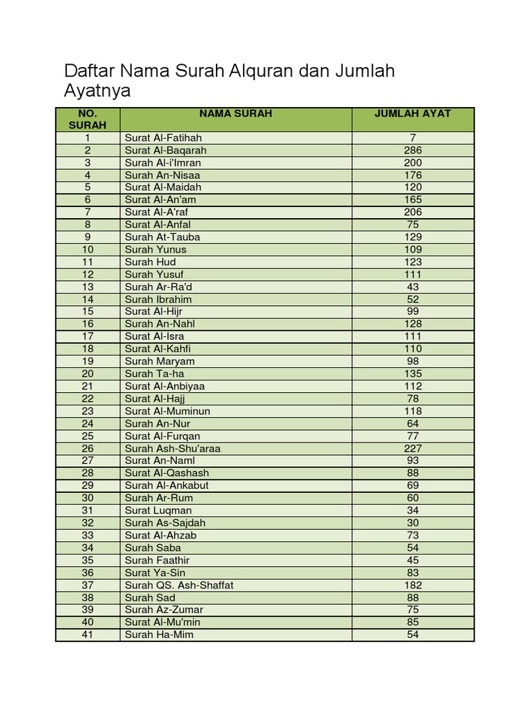 Daftar Nama Surah Alquran Dan Jumlah Ayatnya Pdf